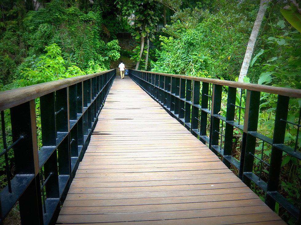 さて、サヤン通りから小道へ入り、小さなホテルのエントランスに到着したら、スパへのこの橋を渡ります。