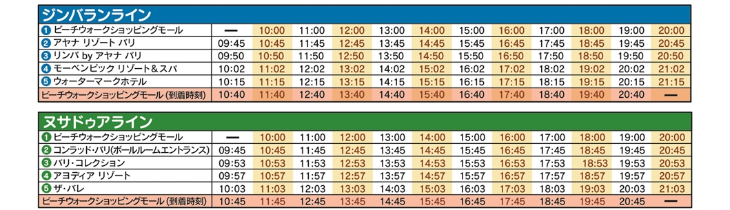 ビーチウォーク ショッピングモール(オアシスゲート)->コンラッド バリ ホテル->バリ コレクション(ショッピングセンター)(ロビーA)->アヨディヤ リゾート ホテル->ザ・バレ->ビーチウォーク ショッピングモール(オアシスゲート)