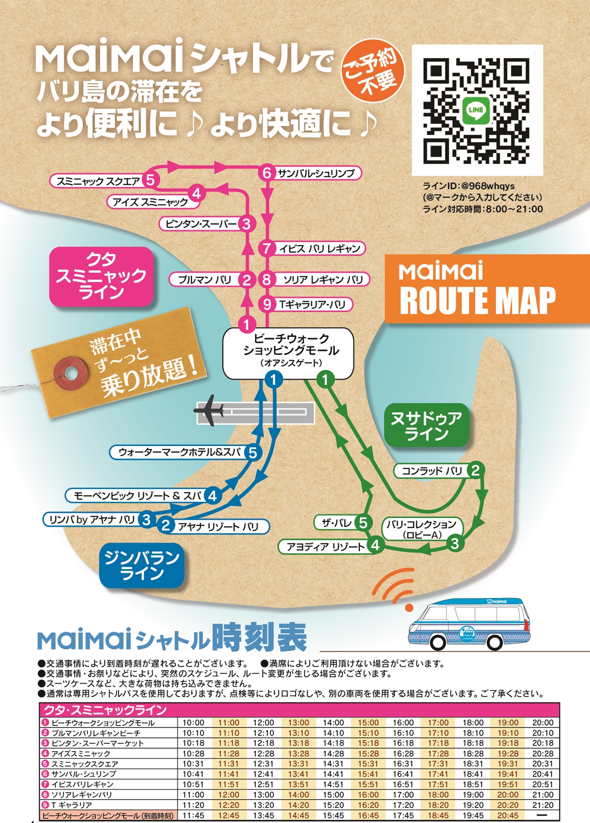 クタのビーチウォーク ショッピングモールを基点とした、3つのラインでの運行となります。