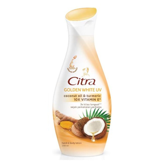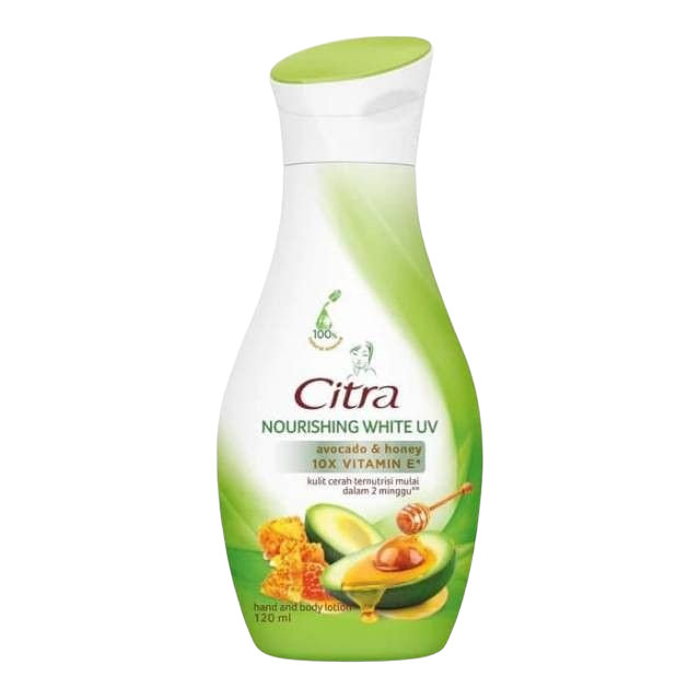 インドネシアの人気コスメ、チトラ(Citra)。べたつかずさらっとした付け心地と香りの良いボディーローションが一番人気です。左のノーリッシング ホワイト UVローションのアボカド&ハニーは、天然保湿剤が豊富な100%天然アボカドエッセンスと、ひじやひざまで肌の最も粗い部分に栄養を与える純粋な蜂蜜が豊富に含まれています。右のゴールデン ホワイト UV ココナッツオイル&ターメリックは、100%天然エッセンスのターメリックとビタミンEと天然保湿剤であるココナッツオイルが豊富に含まれています。毎日のお肌のお手入れで栄養と潤いを与えます。どちらもUVA、UVB光線から肌を保護してくれます。その他にも種類が豊富にあるのでお気に入りの香りを見つけてみて下さい。