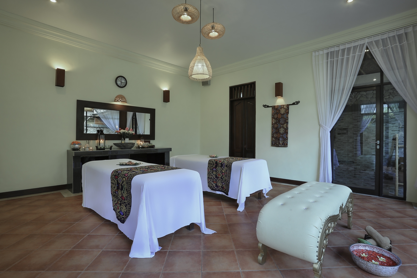 ・フットバス リチュアル、バリニーズマッサージ、モリンガ マスクとミルク スプラッシュ、フラワーバス、ジンジャーティーのサービス。