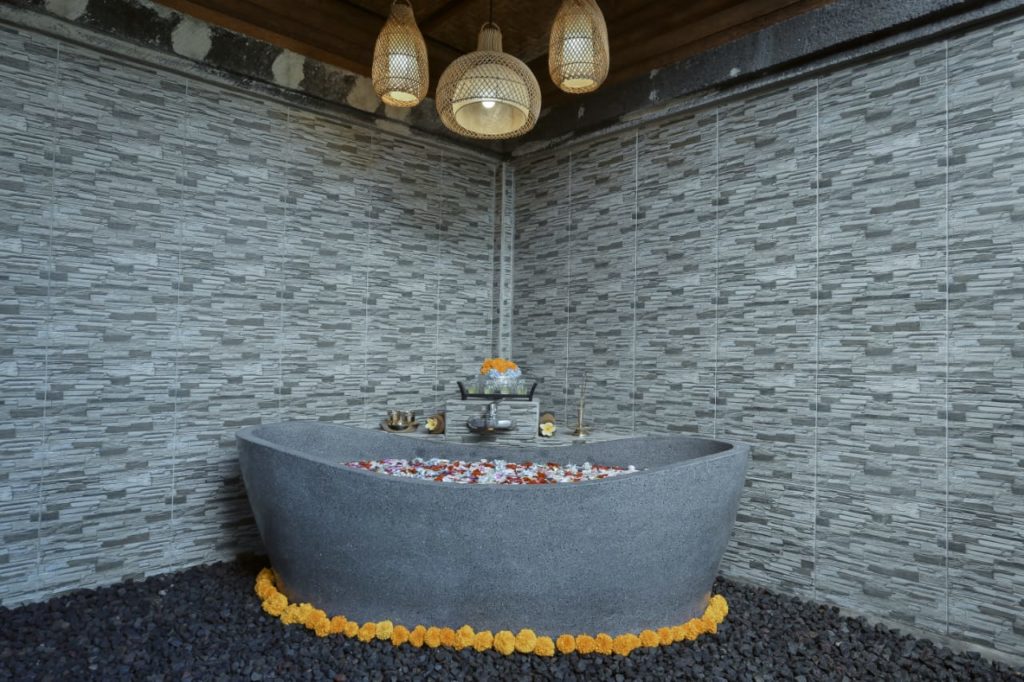 ・フットバス リチュアル 5分、ホットストーンマッサージ 150分、サンバーン ボディーマスク 15分、トラディショナル フェイシャル 40分、フラワーバスまたはミルクバス・シャワー・ジンジャーティー 20分、お食事バリニーズミール付き。