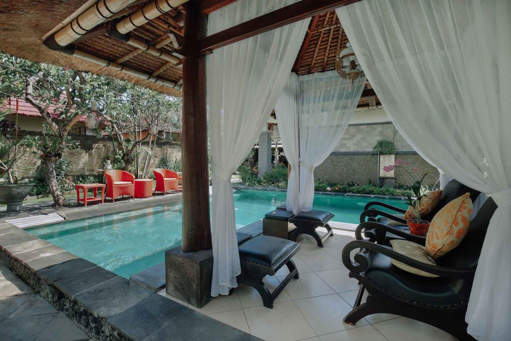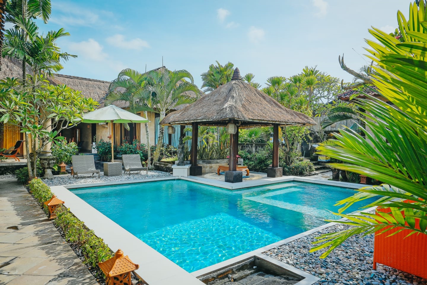 また、南国らしいガーデンにはプールがあり、もしご希望であればスパの前後に泳ぐことも可能です。(水着をお持ち下さいね。)