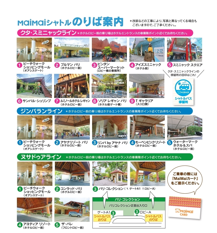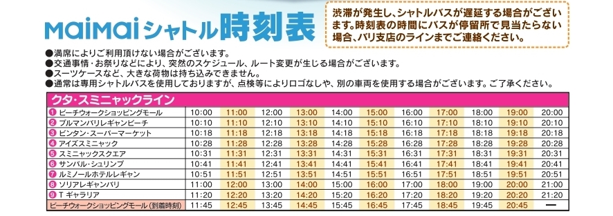 マイマイウェブで、ホテル、オプショナルツアーをご予約のお客様は無料でご乗車頂けるシャトルバスですが、2024/4/1よりクタ・スミニャックラインの一部のスケジュールと停留所が変更となりましたのでお知らせいたします。