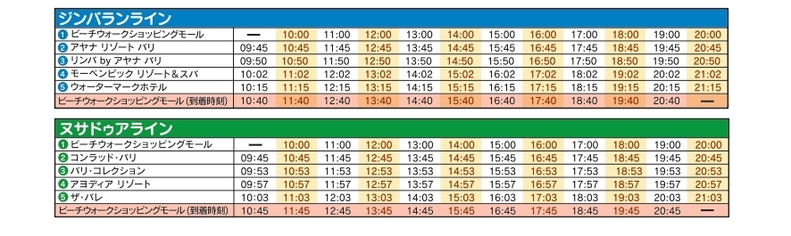 ビーチウォーク ショッピングモール(オアシスゲート)->コンラッド バリ ホテル->バリ コレクション(ショッピングセンター)(ロビーA)->アヨディヤ リゾート ホテル->ザ・バレ->ビーチウォーク ショッピングモール(オアシスゲート)