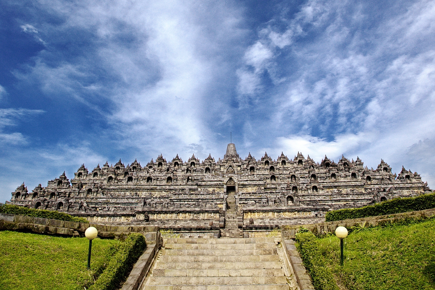 ボロブドゥルは世界最大級の仏教遺跡。8世紀から9世紀の半ばに仏教を辛抱するシャイレーンドラ王朝が建立したとされるが確証はありません。約千年もの間火山灰と密林の中に埋もれていたボロブドゥールは、イギリス占領下の1814年スタンフォードに発見されました。方形をした6層の下部構造と円形の3層の上部構造から構成されピラミッド型をしており、その形は仏教の宇宙観を表現しているとも言われ、華麗な王朝文化が花開いた古都ジョグジャカルタを象徴する、世界遺産です。