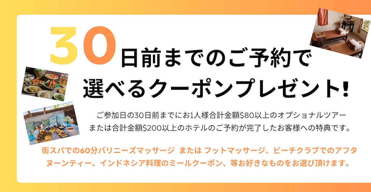 30日前までのご予約で 選べるクーポン プレゼント!!