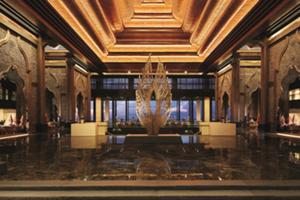 インド洋の青い海を背景に、壮大にダイナミックに空に向かい聳え立つラグジュアリーホテル。