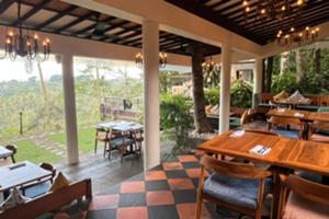 ウブドの渓谷を望む緑に包まれた王家のホテル、ピタマハのテラスレストトラン。