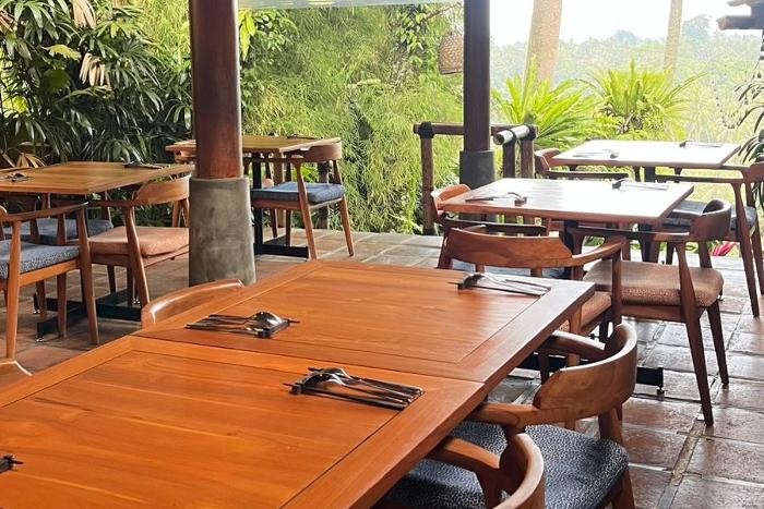 ウブドの渓谷を望む緑に包まれた王家のホテル、ピタマハのテラスレストトラン。
